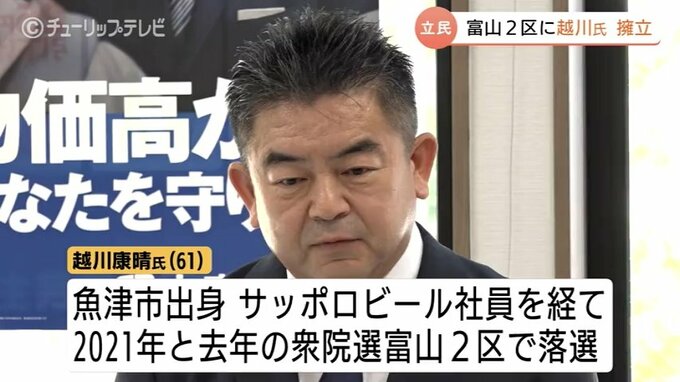 越川氏は魚津市出身の61歳で、サッポロビールの社員を経て2021年と去年の衆院選富山2区に立候補するもいずれも落選。国政へは3度目の挑戦です。