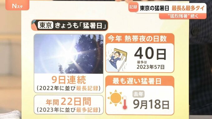きょうも東京都心では気温が35度を超え、9日連続となる猛暑日を観測。これで3年前に記録した猛暑日の最長記録に並びました。