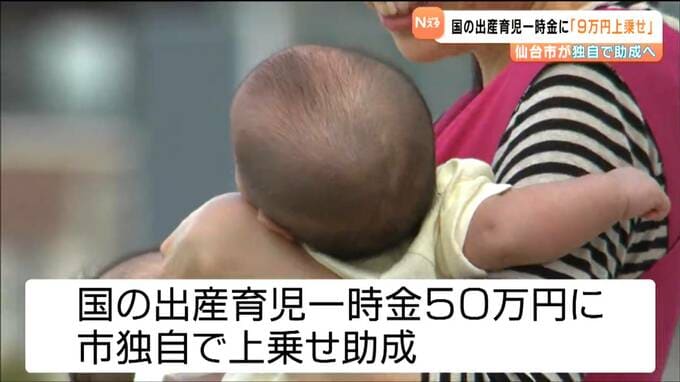 仙台市は、子どもが生まれた際に原則50万円を受け取れる国の出産育児一時金に、市独自で9万円を上乗せして助成する方針を示しました。今年10月1日に生まれた子どもからの適用を目指し来月、市議会に補正予算案を提…
