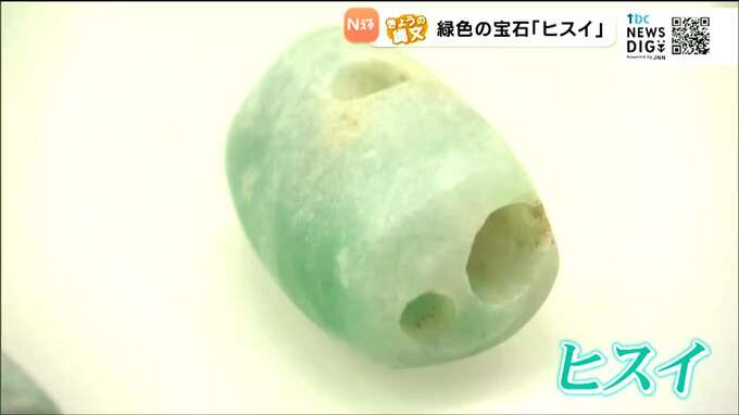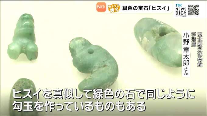 「ヒスイは透明がかった緑をしている。赤も縄文時代によく使われた色だが緑も縄文人が好んだ色でした。ヒスイを真似して緑色の石で同じように勾玉を作っているものもある」
