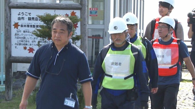現在、噴火警戒レベル1の鶴見岳で小規模な噴火が発生した想定で別府ロープウェイが運行停止となり、スタッフが山頂近くから避難者を徒歩で下山誘導しました。