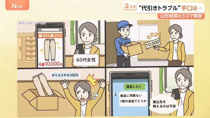 2つ目のケースです。60代の女性が、SNSの動画広告で「綿80%・麻20%のズボンが4着で10000円」という広告を見つけました。代引きで10000円で購入しましたが、箱を開けてみると、ポリエステル100%のズボンが届いたということです。