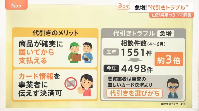 ネット通販などを利用したときに代金と引き換えに宅配便を受け取る「代金引換サービス」。国民生活センターによると、この「代引き」をめぐるトラブルが去年に比べて、なんと3倍に増えているそうです。