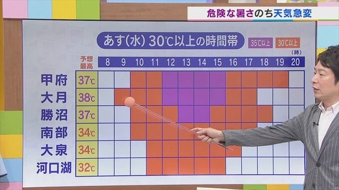 米津龍一気象予報士:あすのお天気ポイントはこちらです。危険な暑さのち天気急変。またあすも暑くなりそうです。といいますのも日本の南に高気圧があって北海道の近くに低気圧があります。この気圧配置を南高北低…
