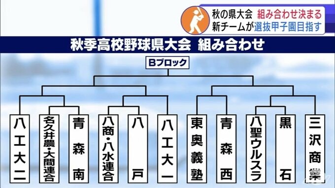 【2025】秋の高校野球・青森県大会 組み合わせ決定 青森山田・八戸学院光星・弘前学院聖愛・八戸工大一は…【全組み合わせ掲載・秋季東北地区高等学校野球青森県大会】 青森テレビ 2025年8月27日(水) 06:45 国内 【Bブロック】秋季東北地区高等学校野球青森県大会 組み合わせ【全掲載】 続いてBブロック。夏ベスト8の2校が名を連ねました。八戸工大一と東奥義塾が2回戦からの登場です。