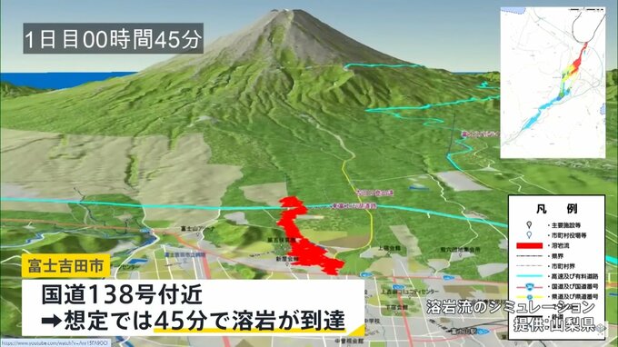 富士山から約10km離れた山梨・富士吉田市では、富士山が噴火した際、約1時間で溶岩が流れ着くケースも想定されています。