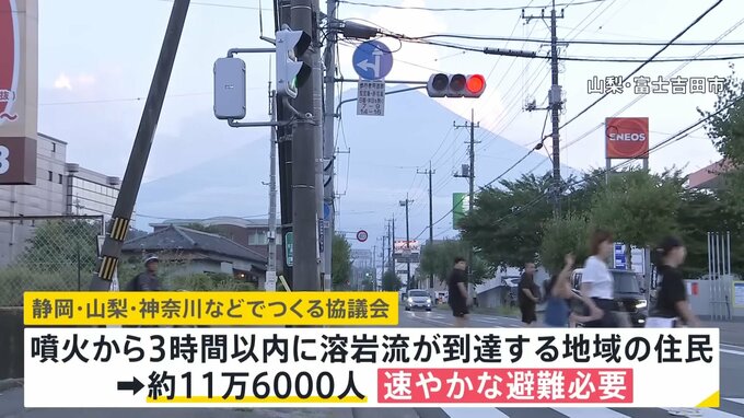 静岡・山梨・神奈川の3県などでつくる協議会によると、噴火から3時間以内に溶岩流が到達する地域に住む人は、約11万6000人で、速やかな避難が必要だとしています。