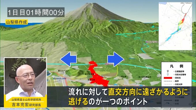 「(溶岩が)向かってくる場合は、流れの方向を見極めて、ゆっくり流れてくるので十分見極められると思う。流れに対して直交方向に遠ざかるように逃げるのが一つのポイント」