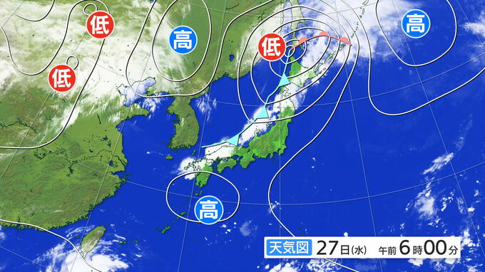 27日午前6時の天気図です。北海道の北に中心を持つ低気圧は発達していて、寒冷前線が日本海側沿岸の地形に沿うようにしてのびています。