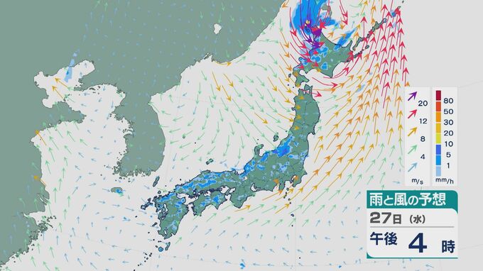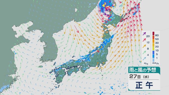 27日の雨と風の予想ですが、昼前から昼過ぎにかけては北陸や東北の日本海側の広い範囲で雨が降り、雨脚が強まるところもありそうです。