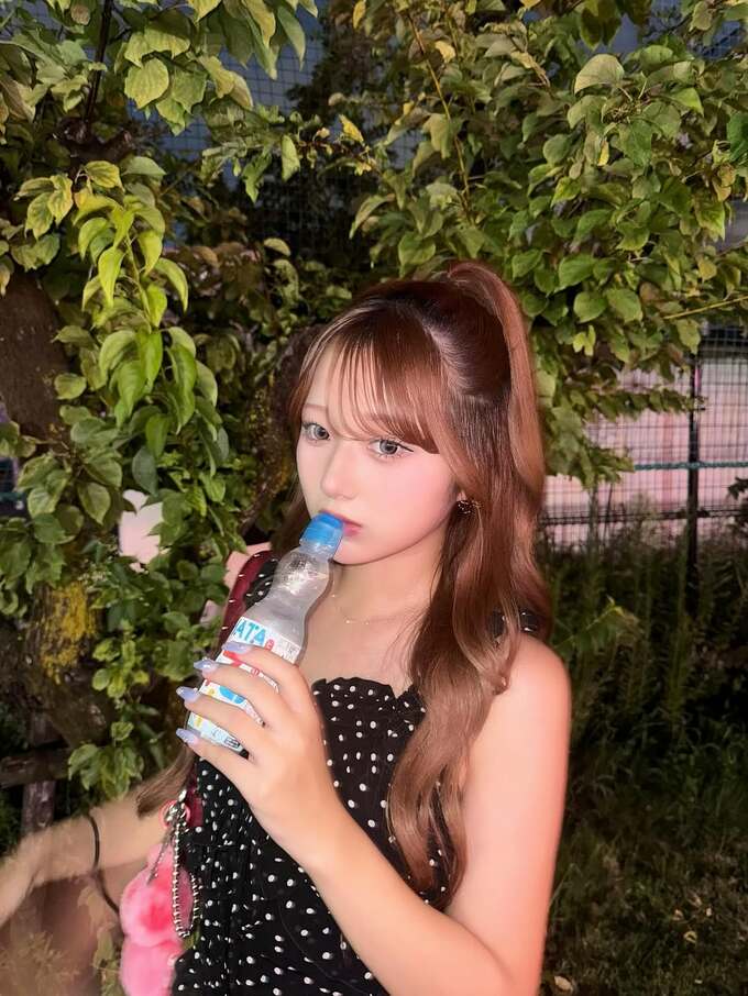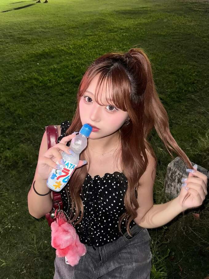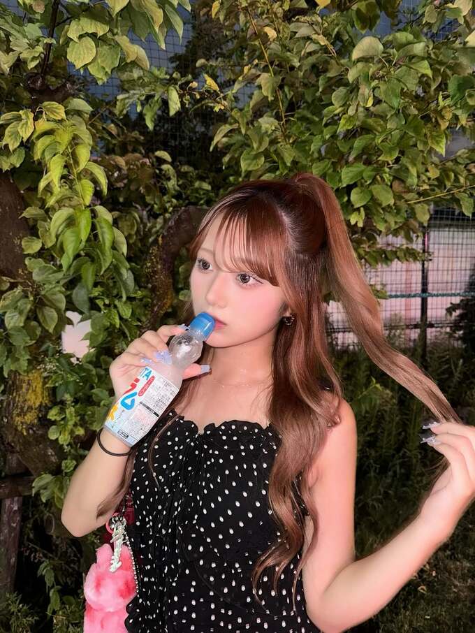 希空さんは、「ラムネ」と一言コメントし、緑豊かな公園で黒地に白いドット柄のトップスを着た希空さんが、夏の定番飲料「ラムネ」を手に撮影した写真を公開しました。
