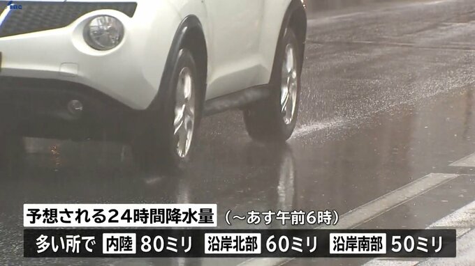 またあす午前6時までに予想される24時間降水量は多い所で、内陸80ミリ、沿岸北部60ミリ、沿岸南部50ミリとなっています。