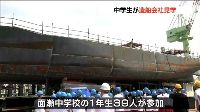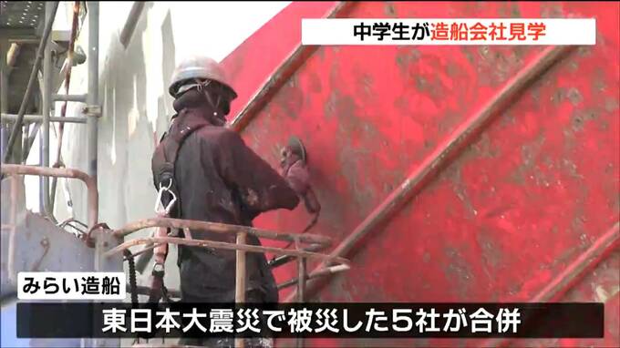見学会が開かれたのは、気仙沼市朝日町の「みらい造船」で、気仙沼市立面瀬中学校の1年生39人が参加しました。2015年に設立されたみらい造船は東日本大震災で被災した5社が合併した造船会社で、大型漁船などの建造や修理を行っています。