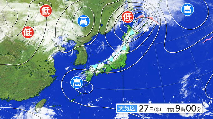 27日午前9時の天気図です。北海道の北に中心を持つ低気圧は発達していて、寒冷前線が日本海側沿岸の地形に沿うようにしてのびています。