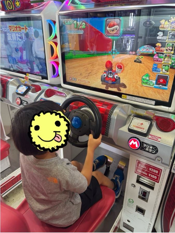 ボウリングを楽しんでいる間、三男はゲームコーナーで過ごしたようです。「ボウリングの間は、三男は隣でゲームタイムでした!やっぱり、マリオカートって楽しいんですね」と記し、三男がマリオカートのアーケードゲームに熱中している様子の写真も共有されています。