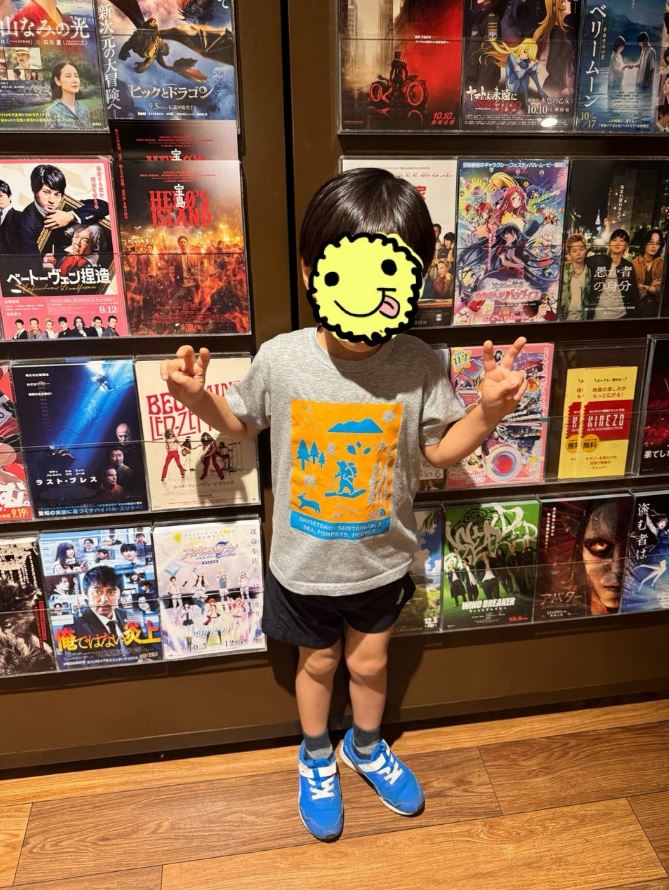 映画では「クレヨンしんちゃんを観ました!大人が観ても楽しい しんちゃん、可愛いなぁ」とコメント。映画館のポスターが並ぶ壁の前で、三男がピースサインをしている写真も掲載されています。