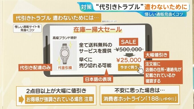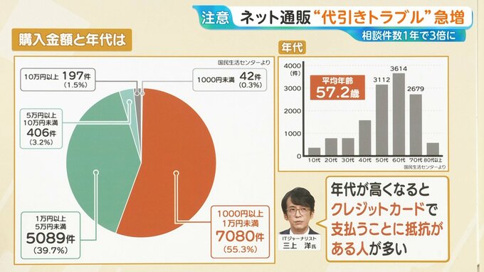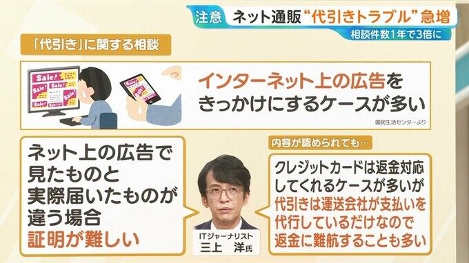 「ネット上の広告で見たものと実際届いたものが違う場合、証明が難しい。また、内容が認められても、返金の対応をしてくれるケースが多いクレジットカードと違い、代引は運送会社が支払いを代行しているだけなので、返金に難航することも多い」