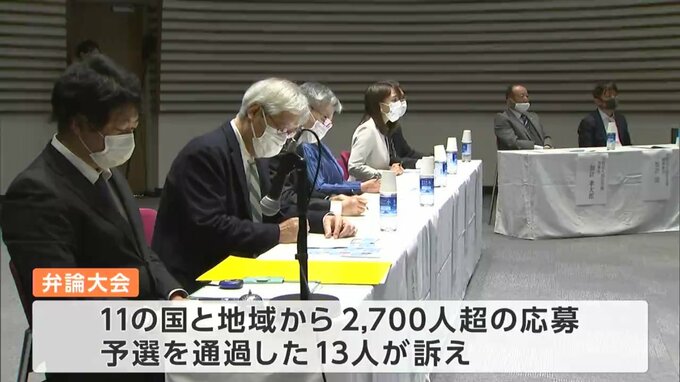 12回目の今年はパキスタンや台湾など11の国と地域から2700人を超える応募があり、予選を通過した13人が流ちょうな日本語で訴えました。
