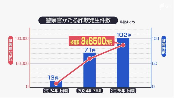 県警のまとめによりますと、2024年の上半期に確認された警察官をかたる詐欺は13件でしたが2025年の上半期はなんと102件に。被害金額は8億8500万円と2024年の同じ時期に比べ9.3倍になっています。警察への信用を逆手に取った特殊詐欺の急増に県警は警戒感を強めています。