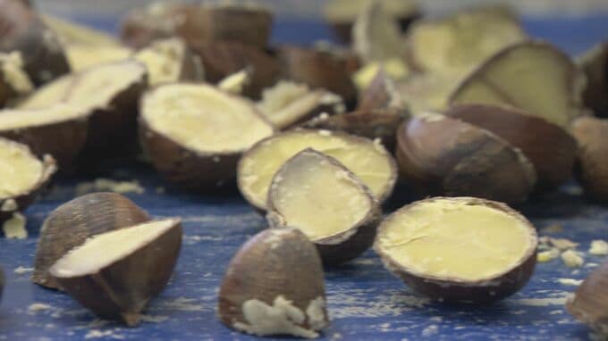 ベルトコンベアで運ばれる栗は、中津川市の名産「栗きんとん」の原料です。創業161年の地元和菓子店「川上屋」では、きのうからことし用の栗きんとんの製造が始まりました。