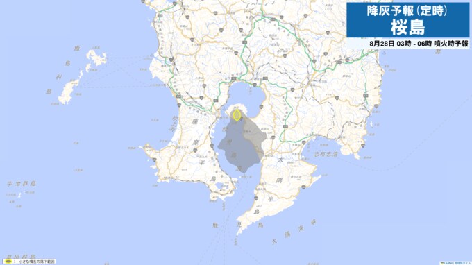 27日21時から24時までは火口から南方向に降灰が予想されます。27日15時から28日9時までに噴火が発生した場合には、以下の方向・距離に降灰及び小さな噴石の落下が予想されます。