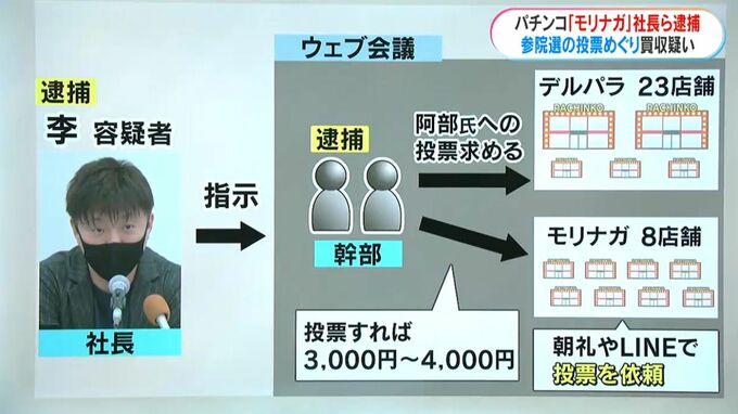 今回逮捕された幹部2人は李容疑者の指示を受けて、モリナガを含む全国の店長とのウェブ会議で阿部氏への投票を求めました。