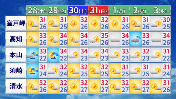 朝の最低気温は、山沿いを中心に涼しさが感じられそうです。一方、日中の最高気温は、全域で30度以上の真夏日となるところが多くなっています。熱中症対策を忘れずに行うようにしてください。