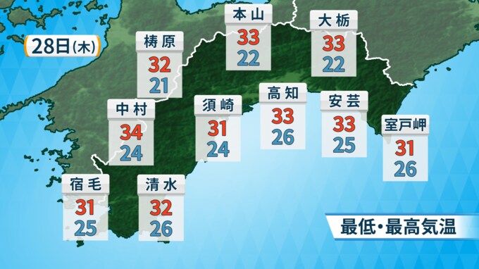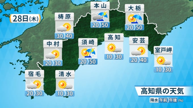 28日の高知県内は、湿った空気の影響で概ね曇り、雨や雷雨となるところがあるでしょう。昼過ぎから夕方は激しい雨の降るところがある見込みです。