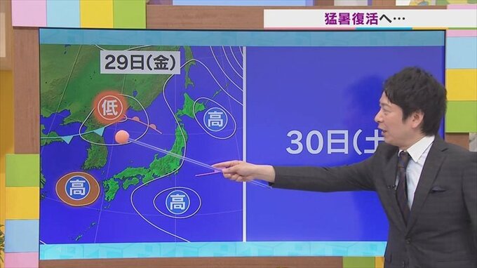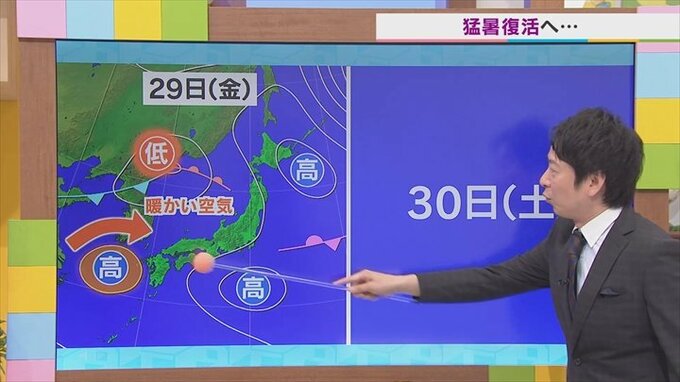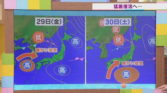 この低気圧が南の方を進んでくると涼しくなるんですが、北にあるということは、気圧の高いところから低いところへと風が流れますから暖かい空気がどんどんこの低気圧に向かって流れ込みやすいんです。