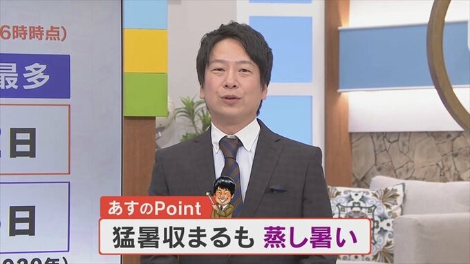 気温がどうなるか見ていくと、甲府の最高気温は3℃低い34℃であすは35℃以上の猛暑日のところは1地点もありません。
