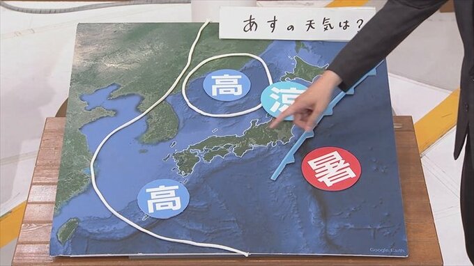 あさって金曜日の天気図となります。注目していただきたいのは、この