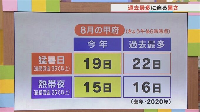 8月の甲府に関して、過去最多の猛暑日は去年と2020年だったんですが