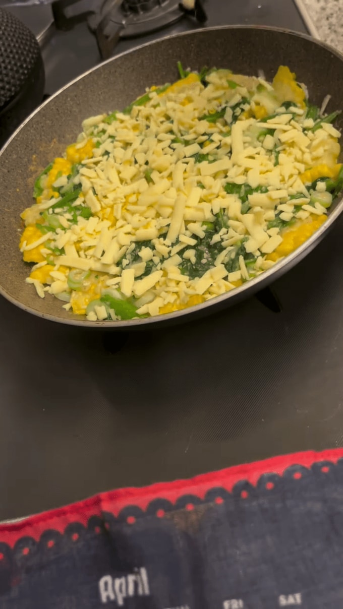 工藤静香さんは、ネギ・コーン・ほうれん草・全粒粉などの材料を混ぜたものをフライパンでチーズと共に焼き上げた料理の動画をアップ。