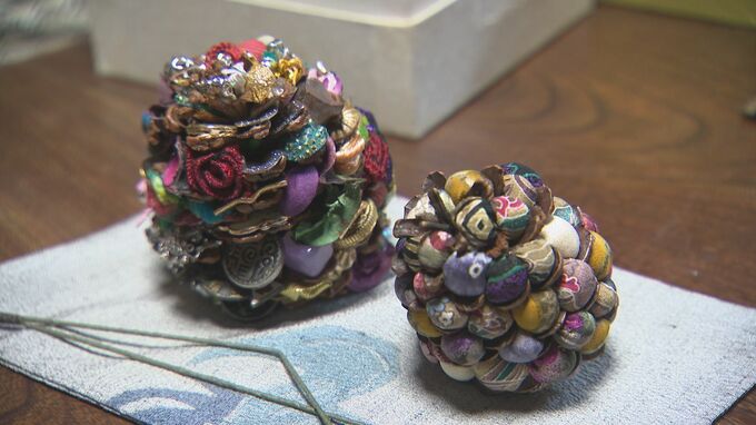 松ぼっくりと布を組み合わせた飾りに、人形用の着物。手織りの布をあしらったストラップ。今も趣味の手芸を続けています。