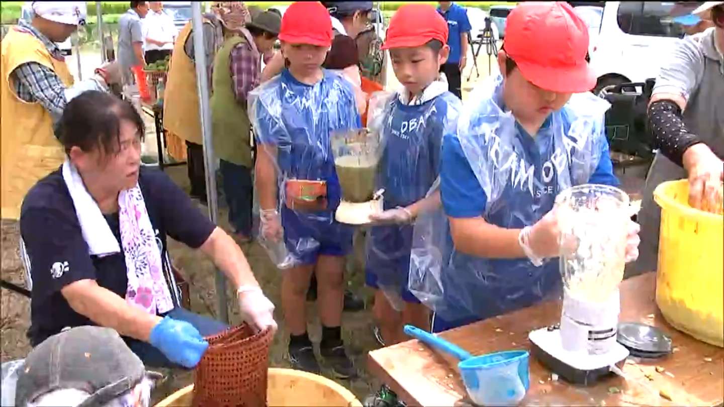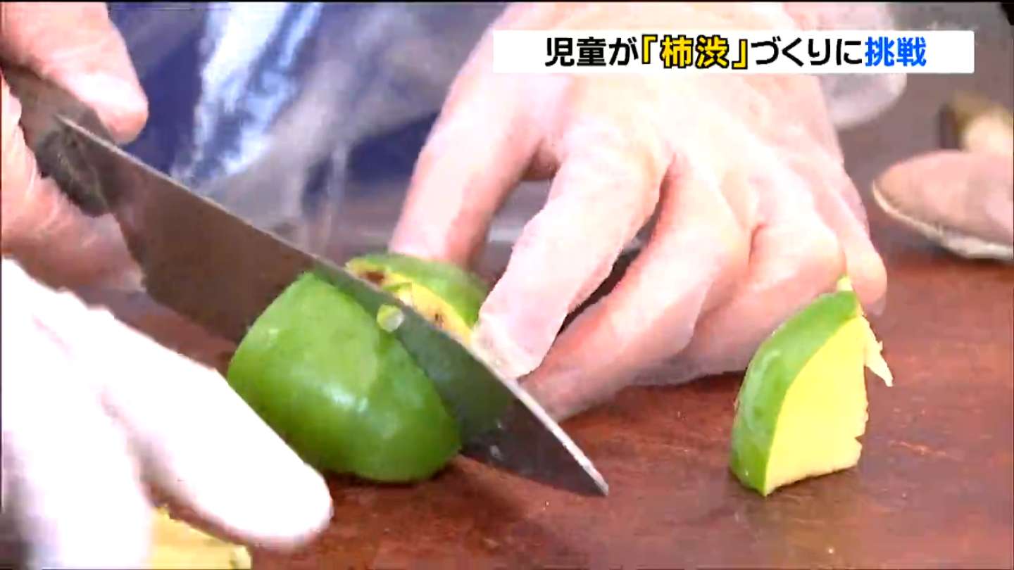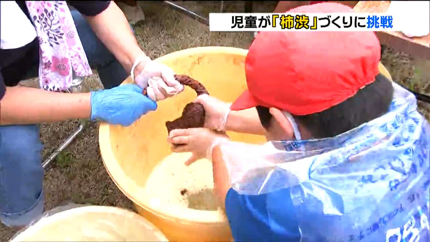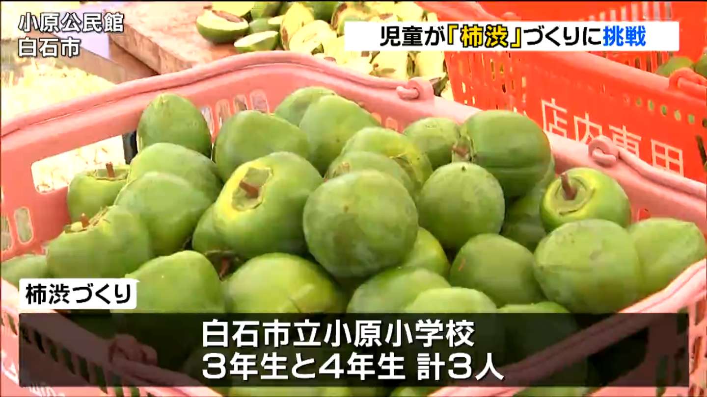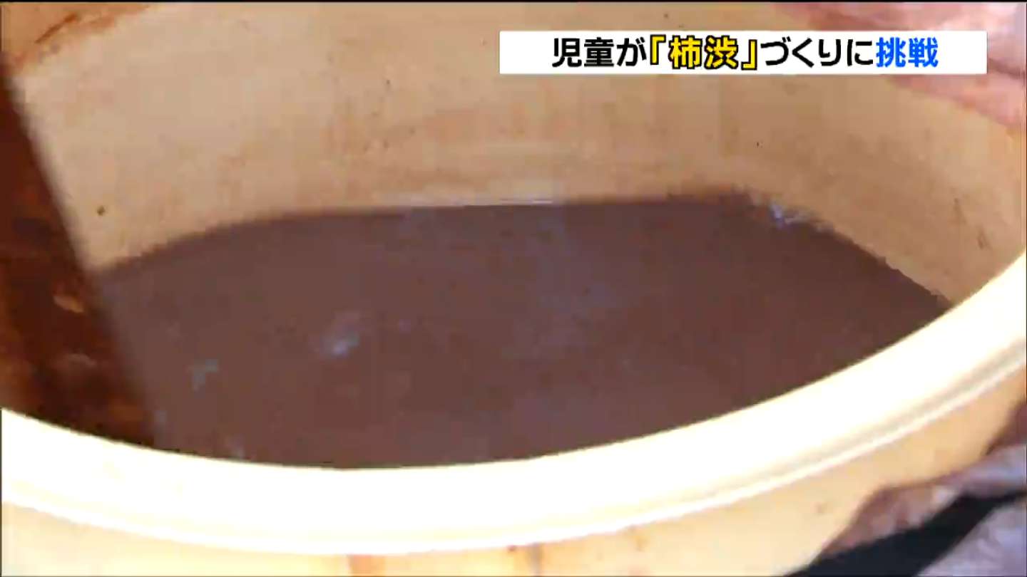 宮城県白石市立小原(おばら)小学校の3年生と4年生合わせて3人は、まだ熟していない青いカキの実を原料にした「柿渋(かきしぶ)」づくりに挑戦しました。