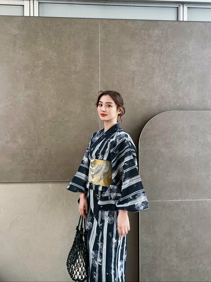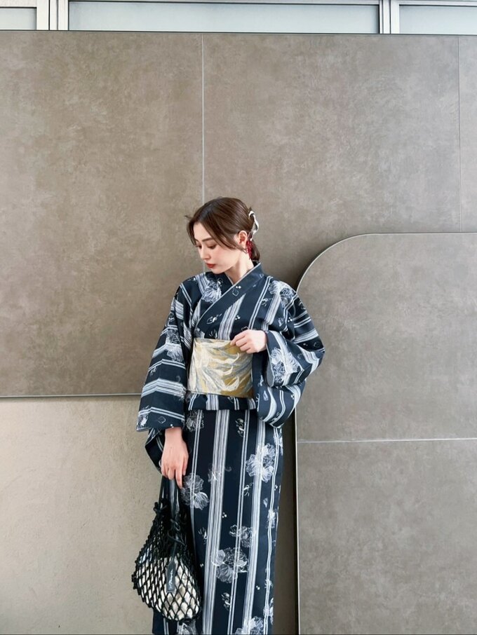 内田さんが着ているこの浴衣は、黒地に白のストライプと花模様がデザインされた、モダンな雰囲気の装いが印象的です。