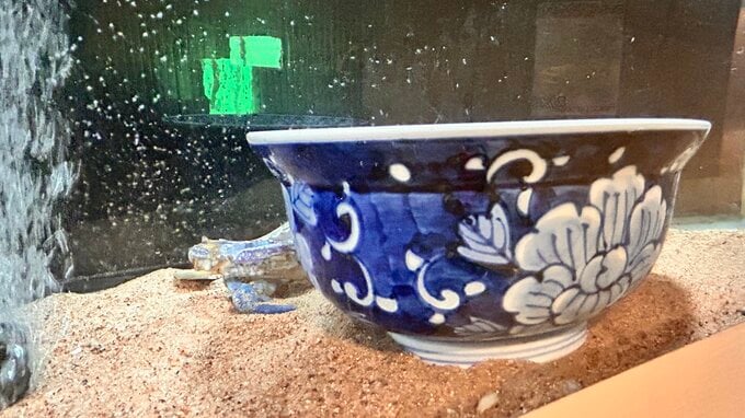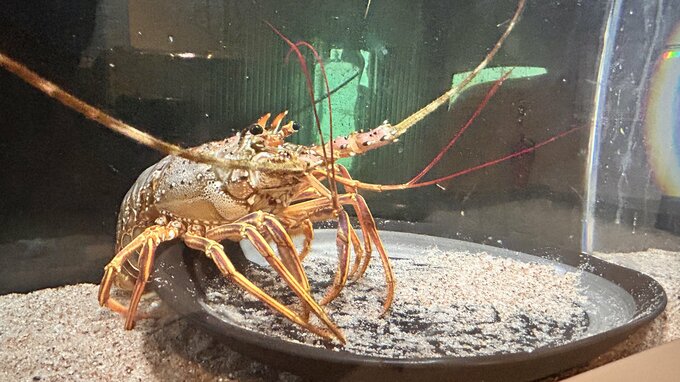 高級食材として知られる生き物は「おいしそう」な装いに。イセエビやタイワンガザミ(ワタリガニ)は、平皿や丼と一緒に展示されています。