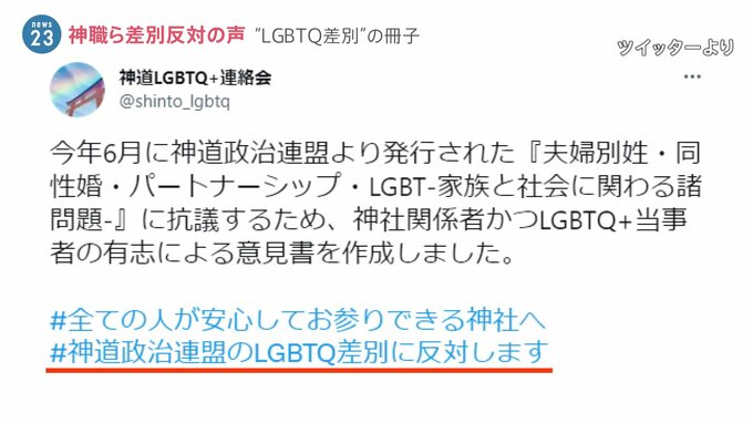 「#神道政治連盟のLGBTQ差別に反対します」先週、神社で働くLGBTQ当事者らがSNSに意見書を投稿しました。