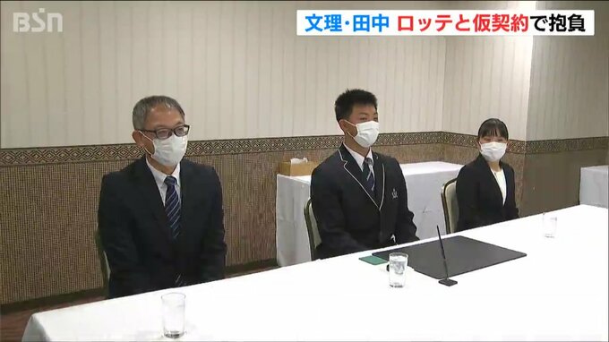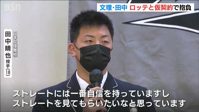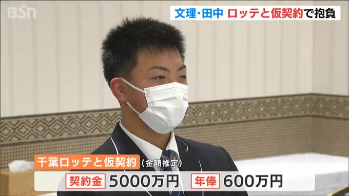 千葉ロッテマリーンズからドラフト3位指名された日本文理の田中晴也(たなか・はるや)投手が、24日新潟市内のホテルで両親同席のもとで入団交渉を行い、契約金5000万円、年俸600万円(いずれも推定)で仮契約を結びました。