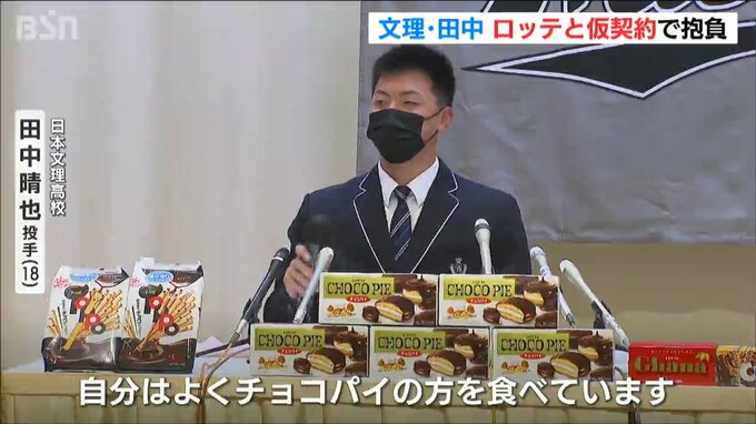 交渉を終えた田中投手は、千葉ロッテで恒例となっている『ロッテの商品に囲まれての記者会見』に臨みました。