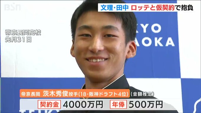 また24日には、阪神タイガースにドラフト4位指名された帝京長岡高校の茨木秀俊(いばらぎ・ひでとし)投手も入団交渉に臨み、契約金4000万円、年俸500万円(いずれも推定)で仮契約を結びました。