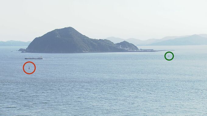 「今、船が2隻南下している。手前に赤いブイと向こうに緑のブイ。この間が伊良湖水道航路の航路幅。船舶が通るには非常に狭い海域なので、交通の難所となっている」
