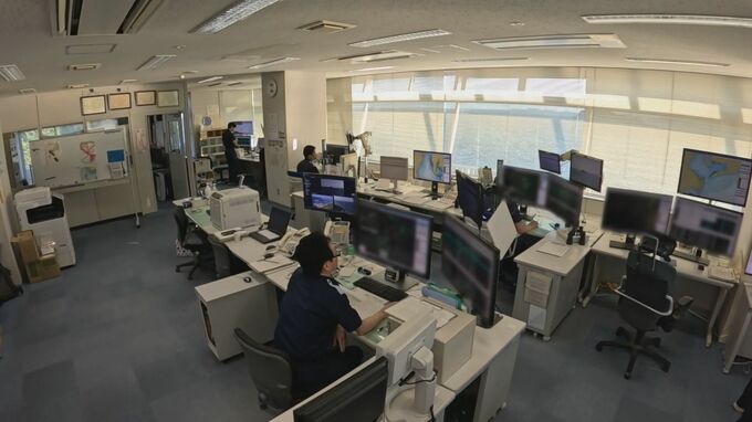 「海の管制官」の主な仕事は、航路に入る船の順番を調整したり、船同士がぶつからないよう情報提供をすること。ここでは約20人の管制官が、24時間365日体制で働いています。