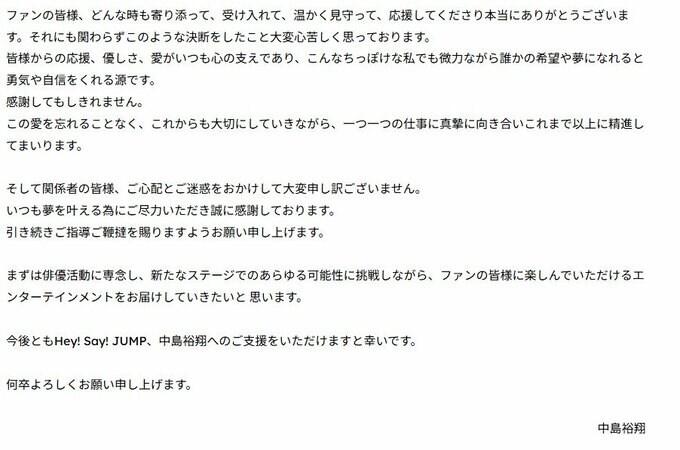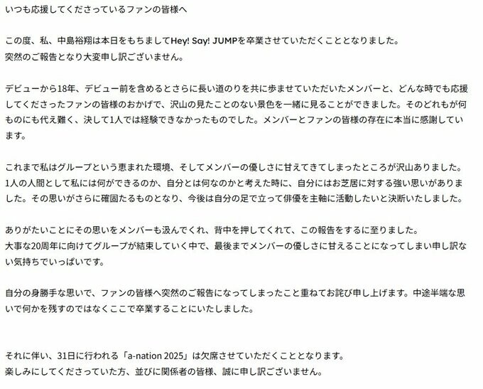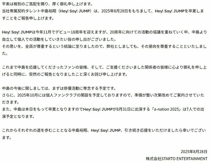 公式サイトでは「当社専属契約タレント中島裕翔(Hey! Say! JUMP)は、2025年8月28日をもちまして、Hey! Say! JUMPを卒業しますことをご報告申し上げます。」と公表。「Hey! Say! JUMPは今年11月でデビュー18周年を迎えますが、20周年に向けての活動の協議を重ねていく中、中島より自立して個人での活動をしていきたい旨の申し出がございました。」と経緯を明かしています。
