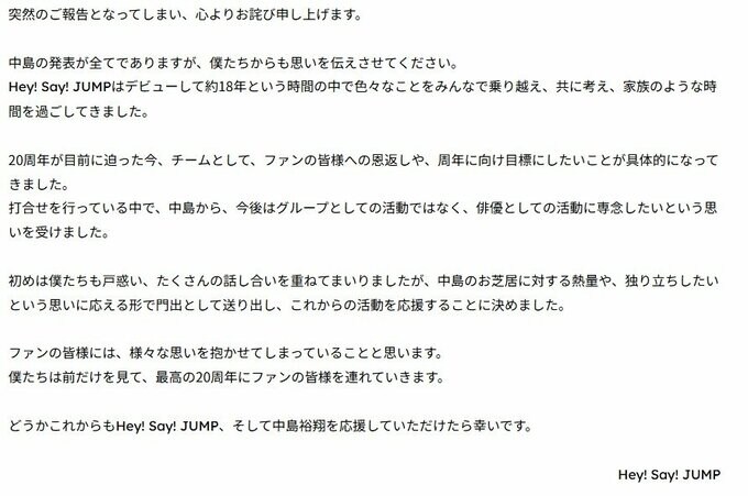 Hey! Say! JUMPもグループとしてのコメントを公表。「中島のお芝居に対する熱量や、独り立ちしたいという思いに応える形で門出として送り出し、これからの活動を応援することに決めました。」「これからもHey! Say! JUMP、そして中島裕翔を応援していただけたら幸いです。」と思いを伝えています。