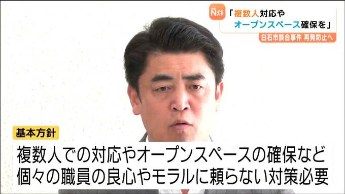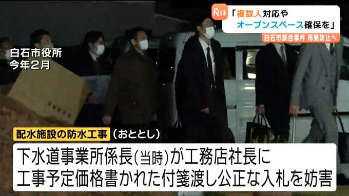 基本方針では、事件の再発防止に向けて複数人での対応やオープンスペースの確保など、個々の職員の良心やモラルに頼らずに組織的・物理的に官製談合を防止する対策が必要としています。