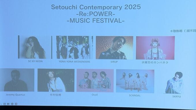 岡山市のイシカワホールディングスが中心となって企画する「Setouchi Contemporary 2025」は、11月に玉野市のJR宇野駅周辺エリアで開催されるフェスで、これまでに「水曜日のカンパネラ」などの出演が決まっていました。