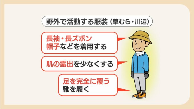長袖・長ズボン・帽子でカバーするなど、肌の露出を控えた服装を意識してください。