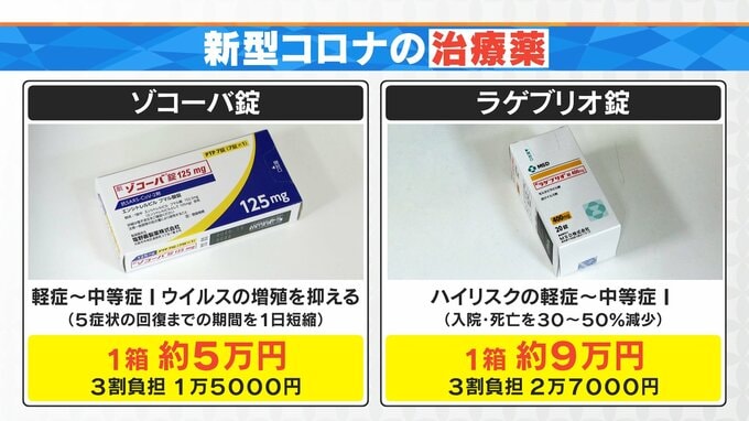例えばゾコーバだと回復までの期間を1日短縮できると。価格は1箱約5万円するんです。3割負担で1万5000円。ラゲブリオは1箱9万円、3割負担で2万7000円。