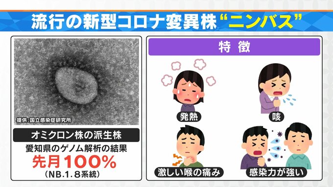 今、流行しているのは「ニンバス」という新型コロナの変異株ですが、愛知県では先月、ゲノム解析の結果100%が「ニンバス」だったということです。